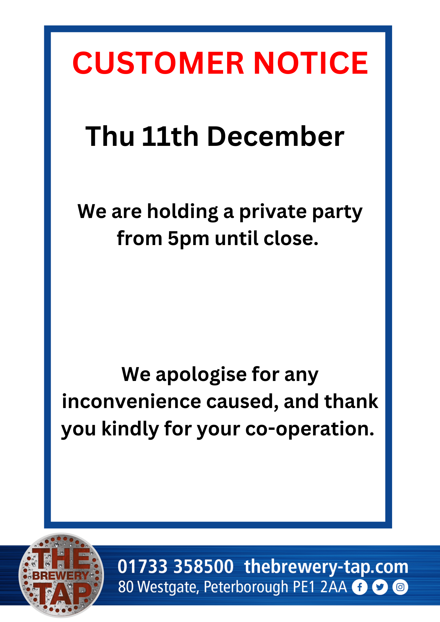 We are holding a private party from 5pm on Thursday 11th December until close. We apologise for any inconvenience caused,…